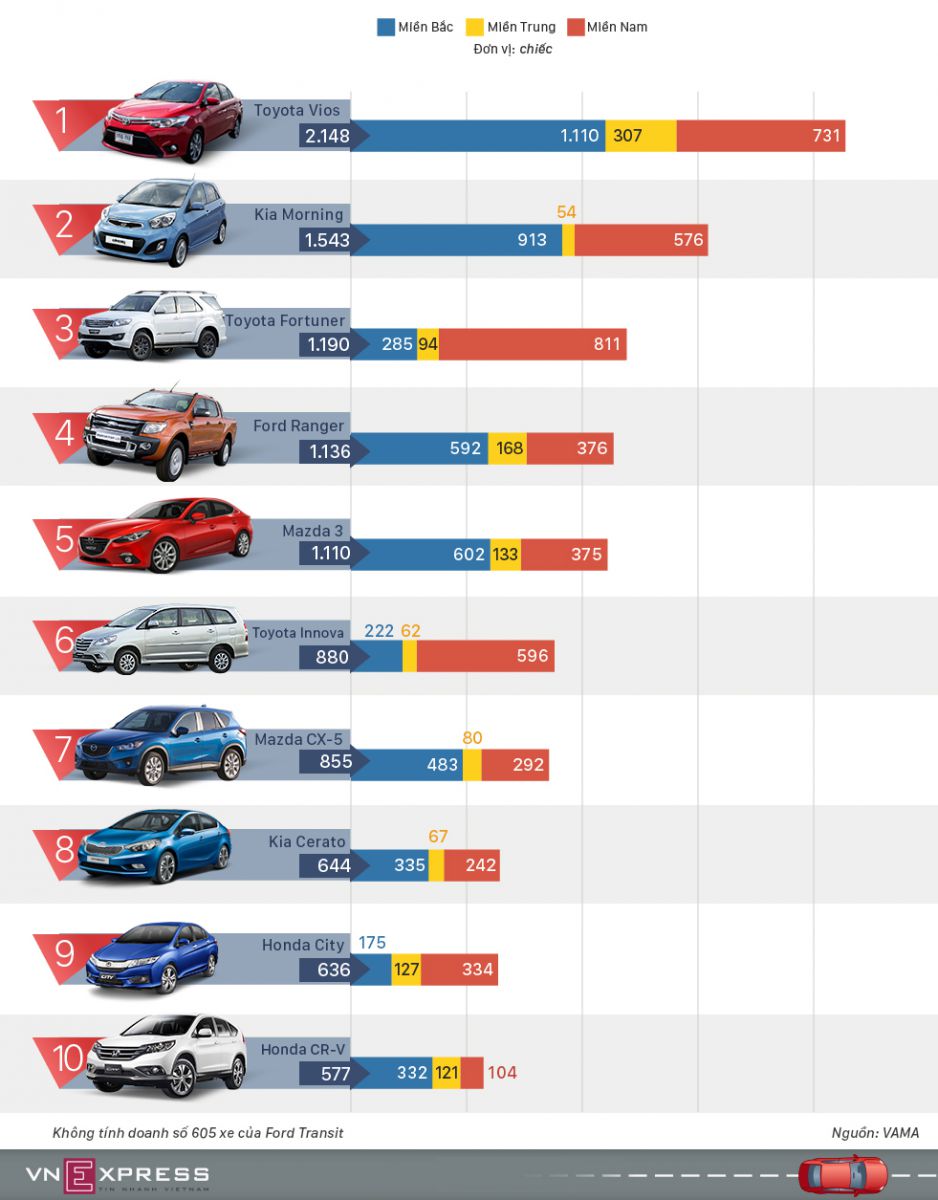 Thứ sáu 11/11/2016 19:00 GMT+7Autopress.vn - 4 vị trí dẫn đầu không dịch chuyển là Vios, Morning, Fortuner và Ranger. Trong khi đó Honda nổi lên với City và CR-V ở hai vị trí 9 và 10.