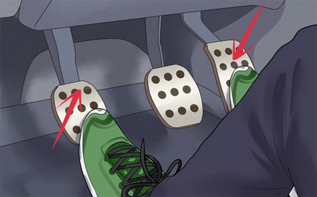 14. Khi muốn dừng lại, di chuyển chân phải từ bàn đạp ga sang bàn đạp phanh và đạp cho đến khi xe giảm tốc độ. Khi giảm dần tốc độ cho đến lúc người lái cảm nhận được xe rung giật, lúc này dùng chân trái đạp chân côn kết hợp phanh cho đến khi xe dừng hẳn. Sau đó chuyển số về N.