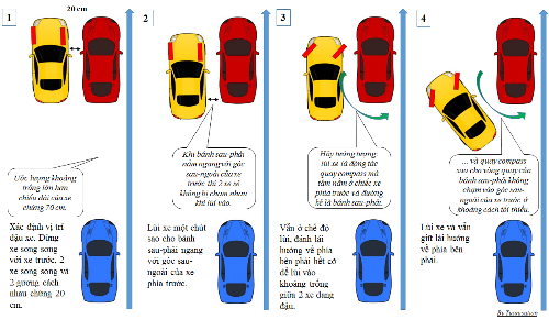 Bắt đầu bằng việc đưa xe ngang hàng với xe đỗ phía trước, khoảng cách giữa 2 xe là 60 cm và đuôi 2 xe ngang nhau.