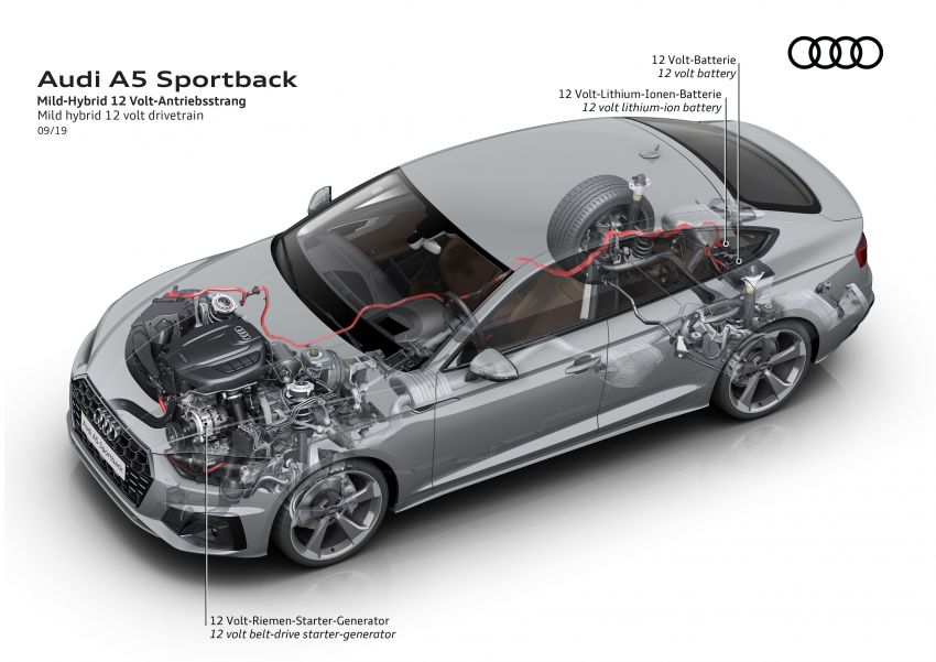 Sức mạnh của A5 được cập nhật có thể có với một loạt các động cơ TFSI và TDI, với đầu ra dao động từ 163 PS đến 347 PS. Tất cả các động cơ đều đạt tiêu chuẩn khí thải Euro 6d-temp. A5 sẽ có được hệ thống điện hybrid nhẹ 12 volt trong khi đó, S5 TDI sẽ có được hệ thống điện 48 volt mạnh hơn, cả 2 đều có thêm hệ thống MHEV được cho là cải thiện hiệu suất nhiên liệu lên tới 0,4 lít / 100 km, đồng thời cung cấp chức năng dừng khởi động động cơ nhanh hơn và mượt mà hơn.