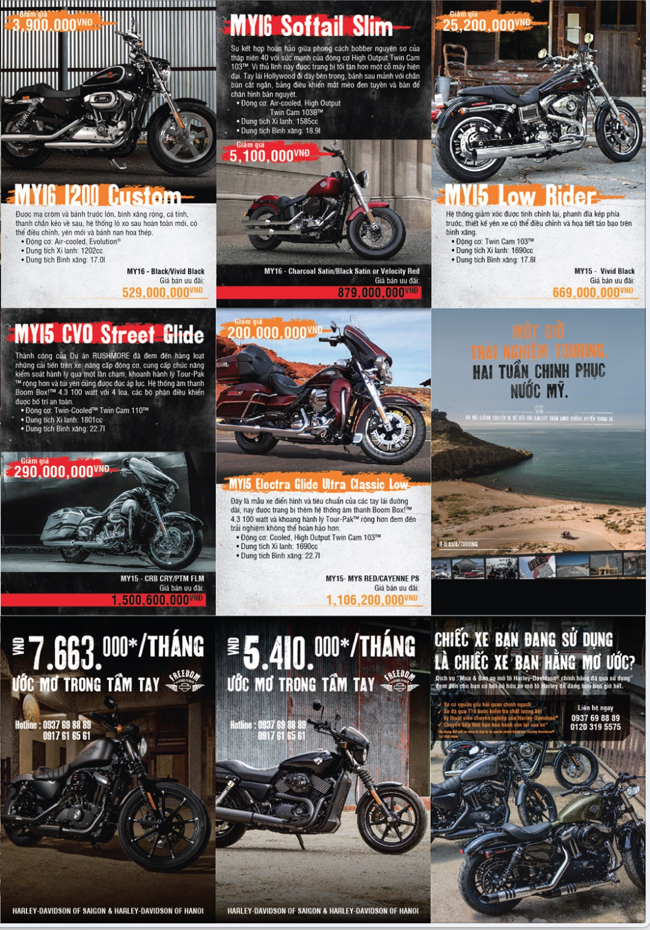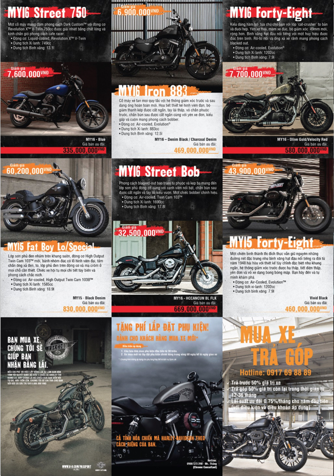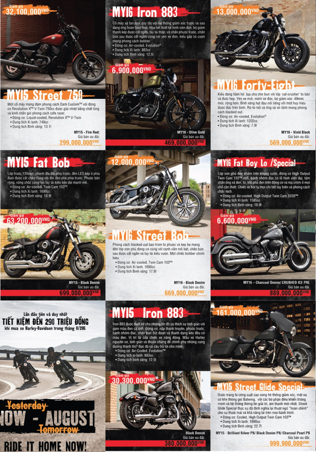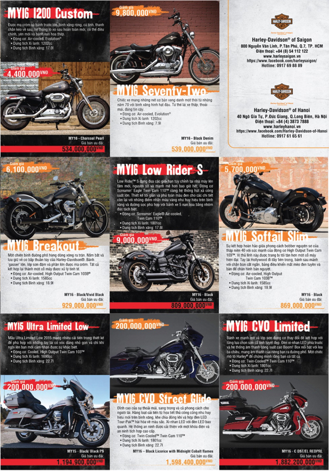 Tất cả 55 mẫu xe được ưu đãi giá đặc biệt sẵn sàng đến tay khách hàng, được hưởng chế độ bảo hành tiêu chuẩn của Harley-Davidson và các chương trình hỗ trợ tài chính mua xe, đổi xe cũ lấy xe mới và tặng phí lắp đặt phụ kiện cho xe mới.