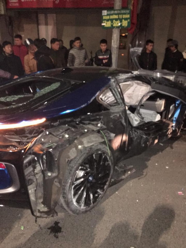 Tại hiện trường siêu xe BMW i8 được dán thông báo "Xe đang đi xét biển" ở phía trước, được một số người dân chứng kiến lúc tai nạn xảy ra cho biết tài xế đã lái xe quá tốc độ rồi mất lái tông vào vỉa hè khiến nhiều cây xanh, biển báo và nhà một người dân cũng bị bể cửa kính.