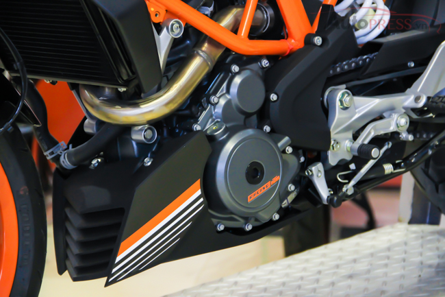Động cơ 250cc của KTM được phát triển dựa trên động cơ 390cc, sử dụng động cơ 4 thì, dung tích 248,8 cm3, có công suất 31 mã lực tại vòng tua máy 9.000 vòng/phút và mô-men xoắn cực đại 24 Nm ở vòng tua máy 7.250 vòng/phút, xe cũng được trang bị hộp số 6 cấp với trọng lượng xe chỉ 139 kg cho Duke và 141 kg cho RC tương đương khoản 0,223 mã lực/kg.