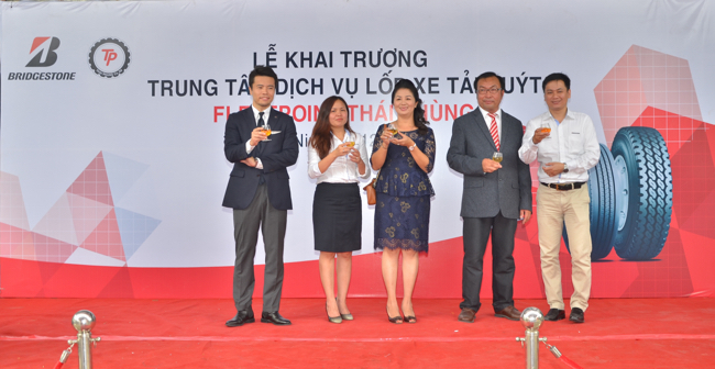 Ông Hiroyuki Saito(bìa trái), Tổng giám đốc Bridgestone Việt Nam chia sẻ: “Bridgestone Việt Nam tin tưởng rằng với hệ thống Fleetpoint trải dài từ Bắc vào Nam cũng như chất lượng dịch vụ được nâng cao sẽ đem đến cho khách hàng Việt những trải nghiệm mới và chuyên nghiệp theo tiêu chuẩn quốc tế của Bridgestone. Việc khai trương Fleetpoint Thái Phùng cũng nằm trong kế hoạch mở rộng hệ thống Đại lý, tiếp cận gần hơn các khách hàng, đáp ứng nhu cầu chăm sóc lốp xe tải và xe buýt ngày càng tăng, đặc biệt trong thời điểm Tết đang đến gần”.