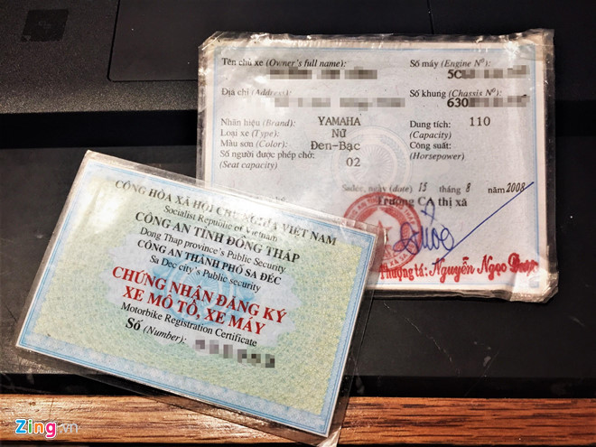 Giấy "mẹ bồng con" là xe giấy tờ thật nhưng số khung, số máy đã bị đục lại, làm giả. Ảnh: Vĩnh Phúc.