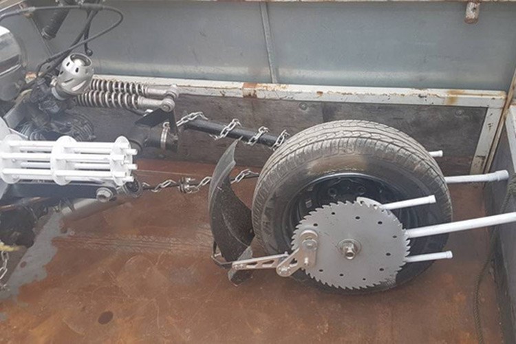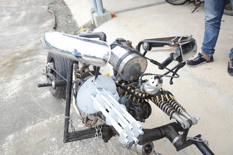 Bên cạnh đó, phần đĩa phanh của xe cũng được nguỵ trang dưới một đĩa răng cưa cùng các thanh sắt giả nòng súng chĩa ra khá nguy hiểm.