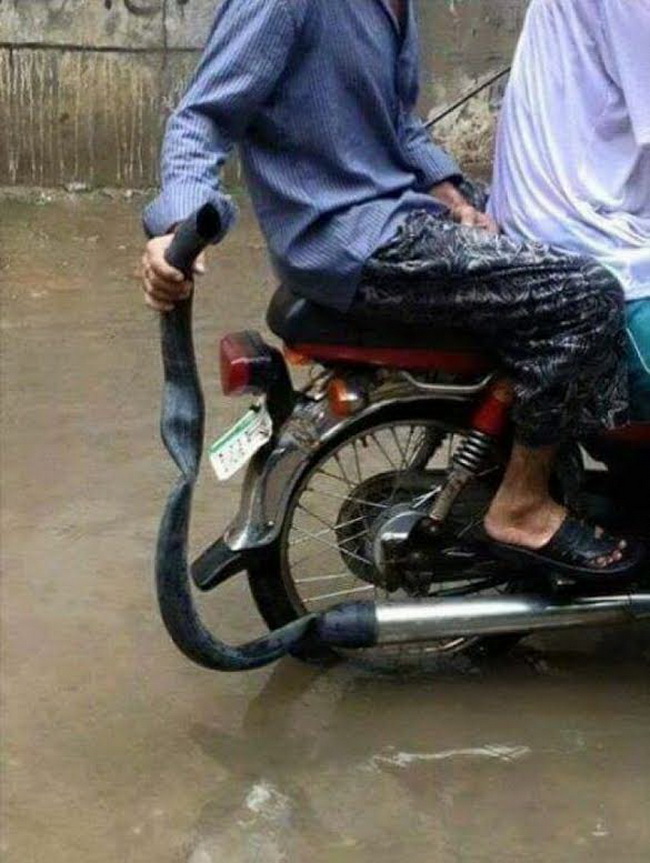 “Chạy xe máy ở những đoạn đường ngập sâu, nếu vê ga không đều sẽ làm nước tràn vào ống bô xe. Kết quả, xe sẽ chết máy ngay lập tức. Nhưng áp dụng cách này thì quá thông minh, tha hồ lướt trên phố ngập nước”, nickname Phan Binh bình luận về hình ảnh bô xe máy được gắn thêm đoạn ống nhựa.