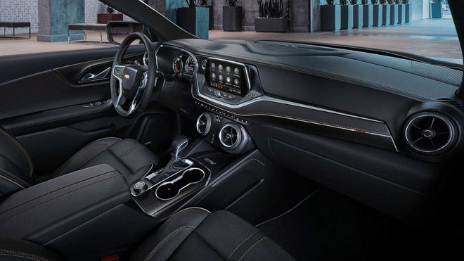 Bên trong nội thất, Blazer 2019 sở hữu hệ thống thông tin giải trí Chevrolet Infotainment 3 sử dụng màn hình cảm ứng 8 inch hỗ trợ kết nối 4G LTE Wi-Fi cùng Apple CarPlay/Android Auto.