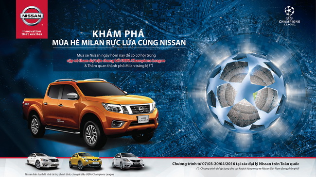 Trong suốt thời gian diễn ra chương trình, khách hàng mua bất kỳ mẫu xe nào trong danh mục sản phẩm của Nissan bao gồm NP300 Navara, Teana, Sunny, Juke và Urvan, sẽ có cơ hội trúng giải thưởng đặc biệt là một cặp vé xem trận chung kết giải bóng đá UEFAChampionsLeague tại thành phố Milan, Ý trong tháng 5/2016 đồng thời khám phá thành phố Milan trong 3 ngày, 2 đêm.
