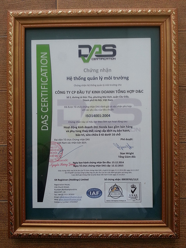 Đặc biệt, trong lĩnh vực kinh doanh Ô tô, HVN đã luôn nỗ lực áp dụng các công nghệ tiên tiến, mang lại hiệu quả môi trường tiêu chuẩn vượt trội trên toàn bộ hệ thống đại lý Ô tô Honda, góp phần tích cực vào việc đem lại những lợi ích thiết thực cho khách hàng cũng như bảo toàn môi trường sống cho xã hội. Tính đến thời điểm hiện tại, toàn bộ hệ thống Ô tô Honda đều đạt tiêu chuẩn Green Dealer (Đại lý Xanh) – được Trung tâm chứng nhận phù hợp – Tổng cục Tiêu chuẩn đo lường chất lượng đánh giá và cấp chứng chỉ ISO 14001:2010 và hoạt động đảm bảo theo tiêu chuẩn ISO 14001:2010 – tiêu chuẩn khắt khe về môi trường!
