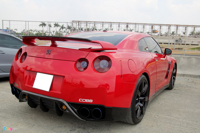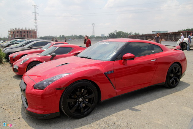 Dàn xe màu đỏ nổi bật với chiếc Nissan GT-R độ pô và một số chi tiết ngoại thất.