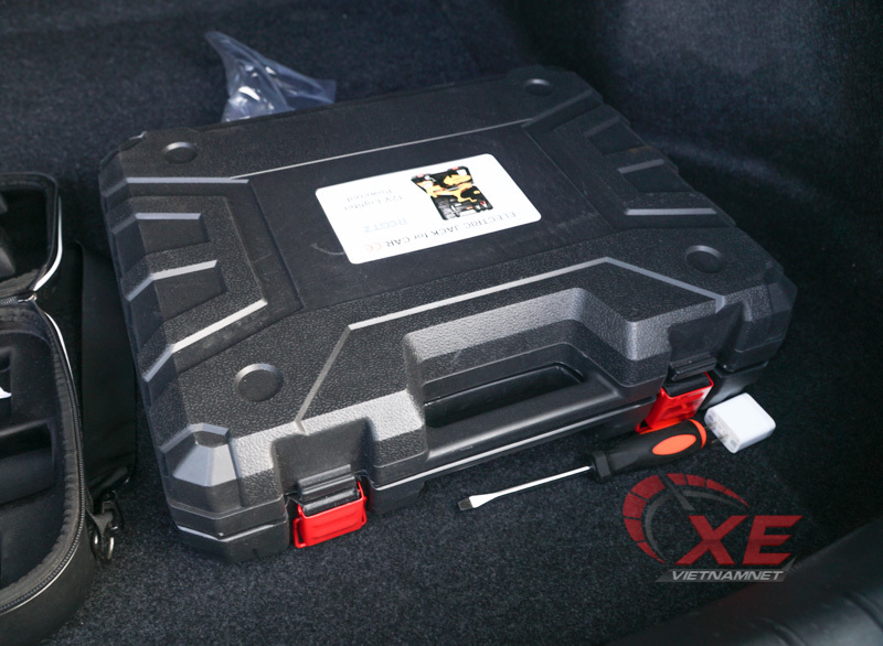 Bên trong vali có 3 dụng cụ chính chạy điện 12V, gồm kích gầm (tải trọng tối đa 3 tấn) với 2 đế nâng riêng cho xe sedan và SUV, súng tháo ốc với 4 kích cỡ đầu khẩu (17, 19, 21 và 22mm), bơm có đồng hồ. Cả 3 dụng cụ này dễ dàng kết nối với nguồn điện 12V trên ô tô thông qua dây jack cắm dài 3,5m. Ngoài ra, vali có thêm một vài dụng cụ nhỏ đi kèm như tuốc-nơ-vit, búa kiêm phá kính, kẹp điện ắc-quy chuyển đầu tẩu 12V.
