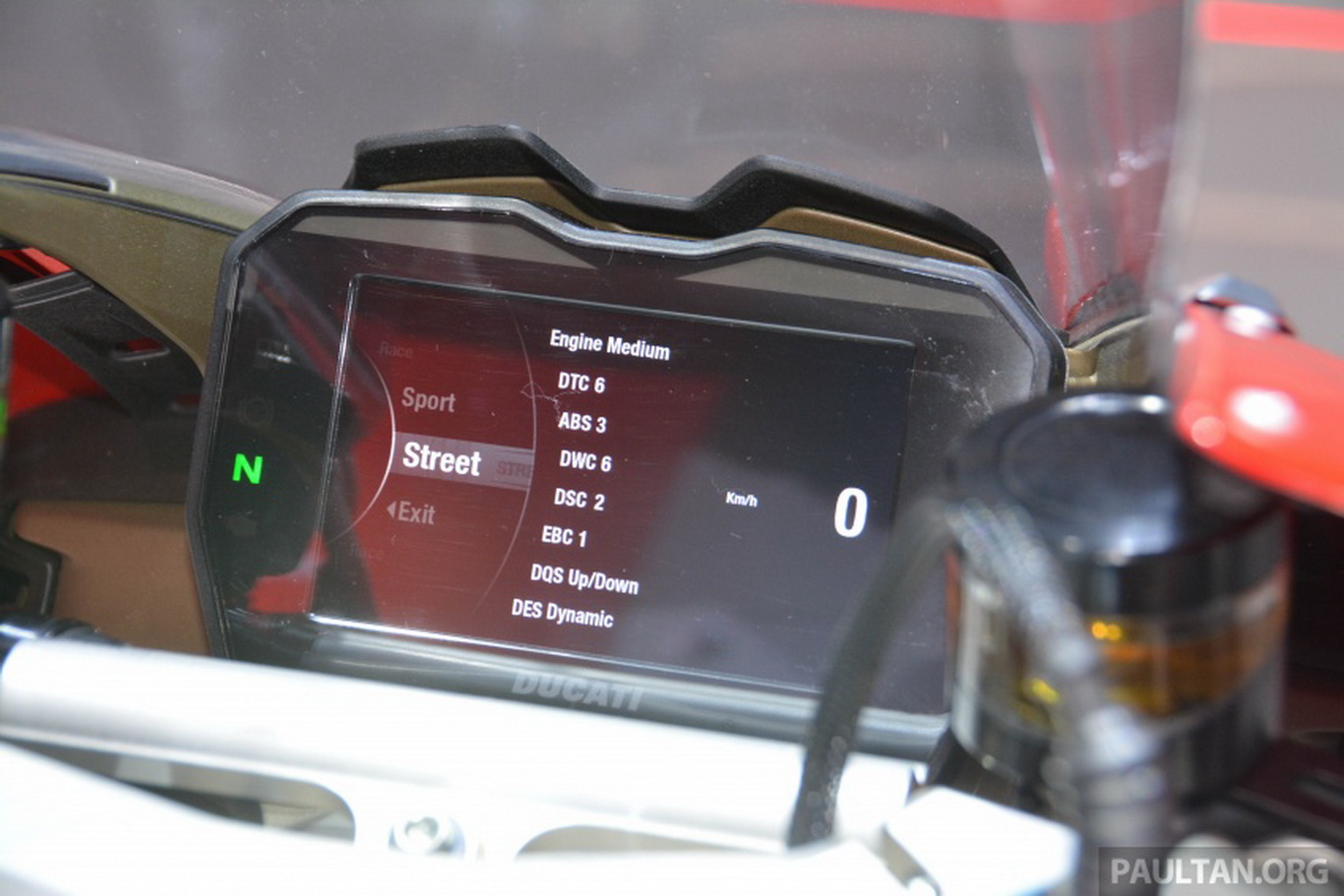 Là một chiếc superbike hiệu suất cao của Ducati, Panigale V4 tất nhiên được thừa hưởng trang thiết bị hàng đầu như phanh Brembo, phuộc Ohlins. Bên cạnh đó, tại buồng điều khiển chính, Ducati trang bị màn hình TFT LCD hiển thị tất cả những thông tin cần thiết cho người lái. Đồng thời, các công tắc chính được đặt trên tay lái cho phép người lái lựa chọn và cá nhân hóa chế độ lái, độ bám đường và điều chỉnh hệ thống treo.