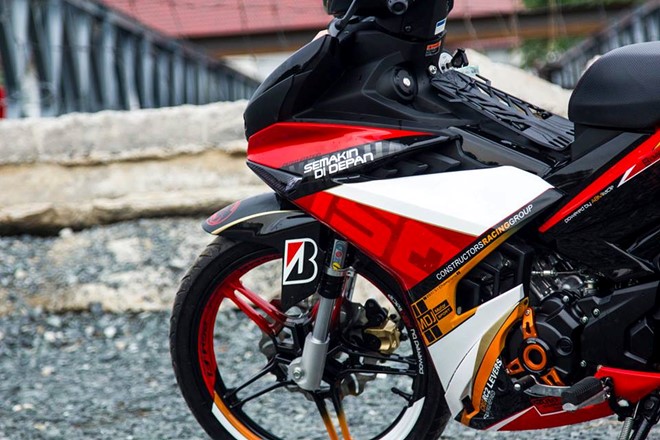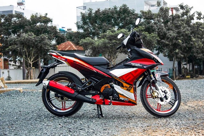 Chiếc xe côn tay vẫn giữ lại màu đỏ - trắng như màu zin của xe nhưng nhấn thêm bằng màu cam nổi bật, tạo vẻ cá tính và độc đáo hơn. Cặp mâm cũng được sơn hài hòa với dàn áo về cả màu sắc và phong cách.