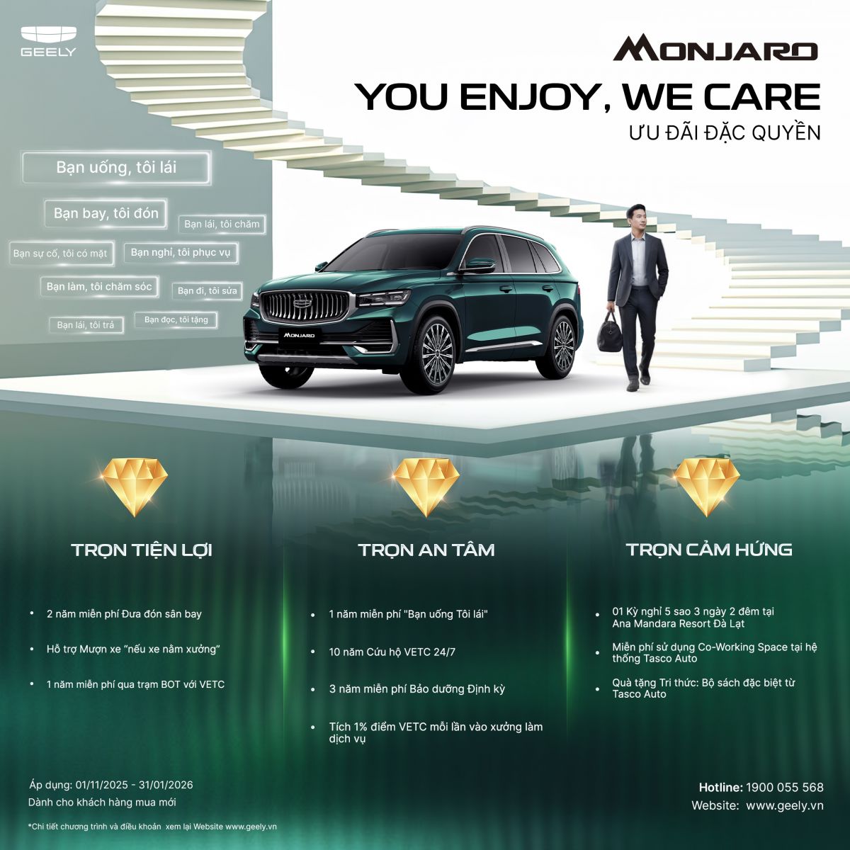 Không dừng lại ở đó, trong tháng 11/2025, khách hàng ký hợp đồng mua Geely Monjaro Premium hoặc Flagship sẽ được hưởng tổng mức ưu đãi lên đến 115 triệu đồng, bên cạnh các đặc quyền chăm sóc kể trên. Đây là một trong những chương trình tri ân có giá trị cao nhất mà Geely Việt Nam từng triển khai, thể hiện cam kết đồng hành cùng người dùng Việt một cách lâu dài và sâu sắc.