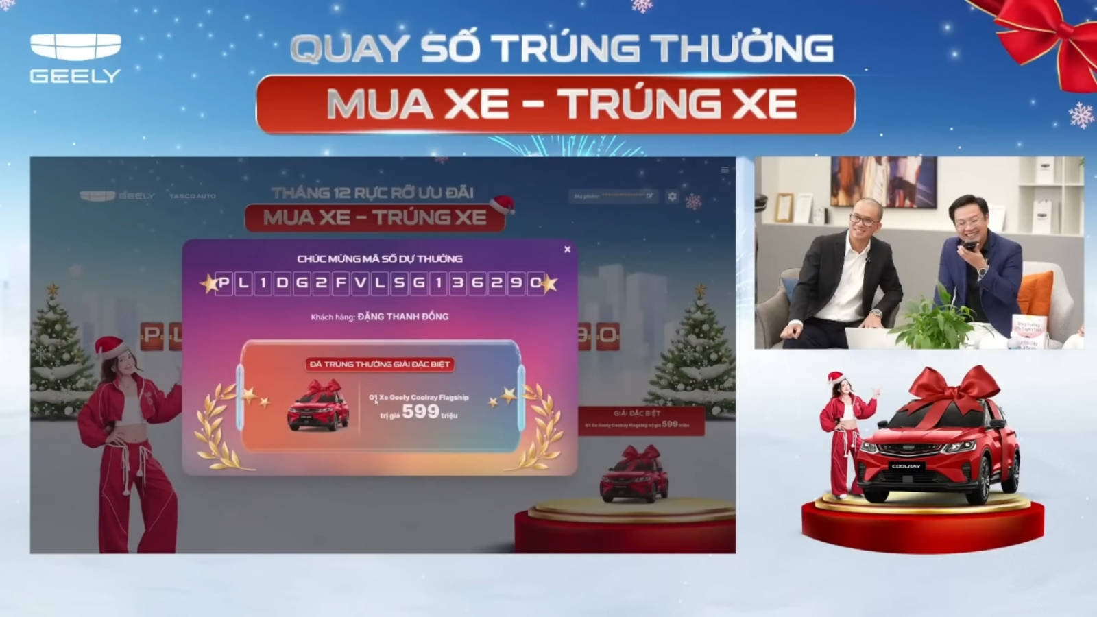 Tháng 12/2025, Geely Việt Nam đã gây chú ý khi tổ chức chương trình “May mắn cùng Geely | Mua xe – Trúng xe” với quy mô toàn quốc. Hàng nghìn khách hàng tham dự, trong đó giải đặc biệt được trao cho anh Đặng Thanh Đồng, người may mắn sở hữu một chiếc Coolray Flagship trị giá 599 triệu đồng. Đây là lần thứ ba Geely tổ chức chương trình bốc thăm trúng xe và đều nhận được phản hồi tích cực nhờ quy trình tổ chức minh bạch, công khai, củng cố niềm tin của khách hàng dành cho thương hiệu.