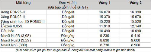 Sau khi tăng gần 1.000 đồng, mỗi lít xăng E5 đang được doanh nghiệp xăng dầu bán ra phổ biến ở mức 15.220 đồng một lít, kể từ sau 15h30 chiều nay. Xăng RON 92 tăng lên 15.370 đồng một lít. Các mặt hàng khác cụ thể như sau: