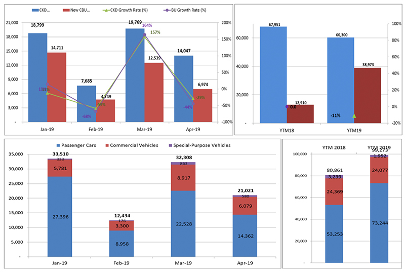 Ô tô lắp ráp trong nước thống kê bán được 14.047 chiếc, ít hơn 3.863 chiếc (giảm 21,5%) so với tháng 4/2018. Trong khi đó, mặc dù ô tô nhập khẩu tháng vừa qua bán được 6.974 chiếc, tăng 3.761 (117%) so với cùng kỳ năm ngoái, nhưng lại giảm tới 5.565 chiếc so với tháng 3/2019.