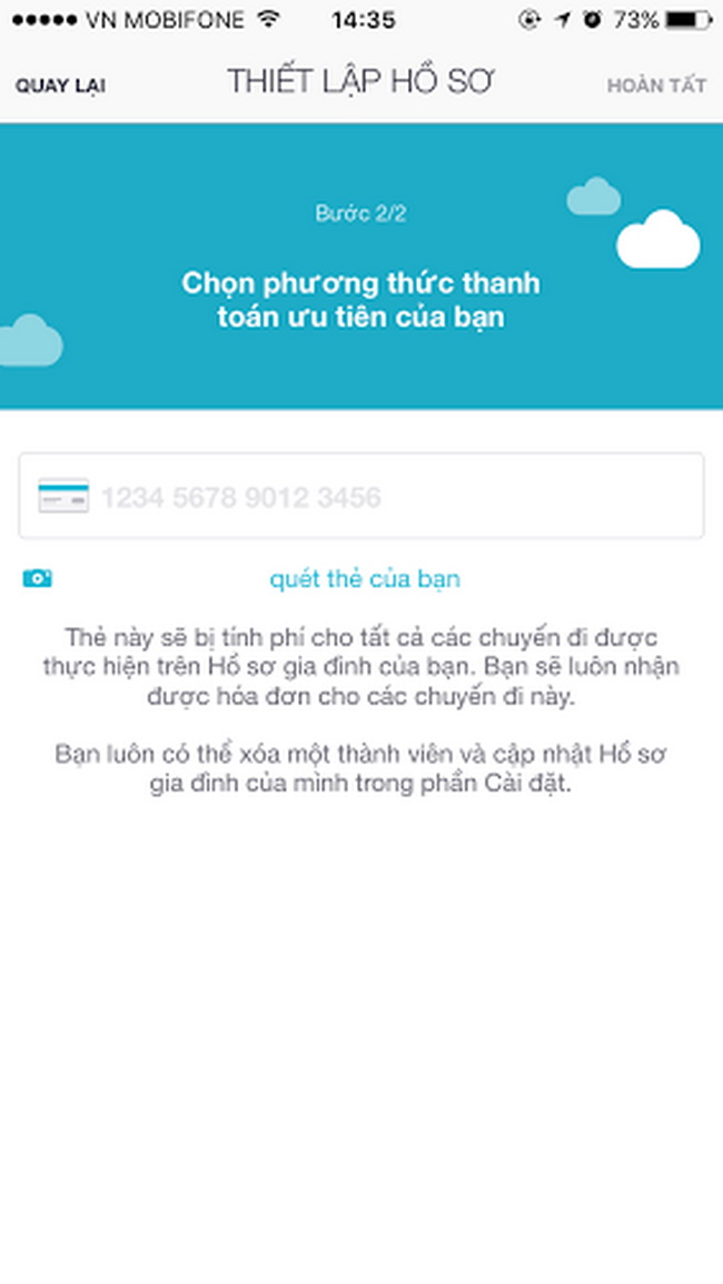 • Chi phí của chuyến đi sẽ được tự động thanh toán với “Hồ sơ Gia đình” và người thiết lập sẽ nhận được hóa đơn của mỗi chuyến đi.