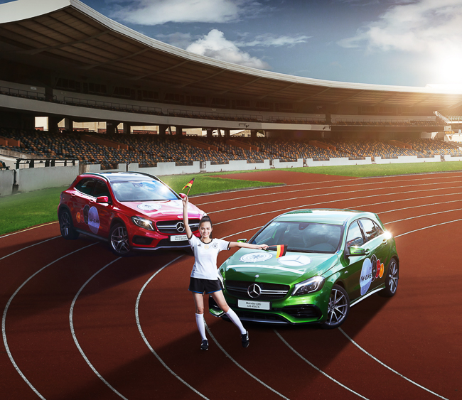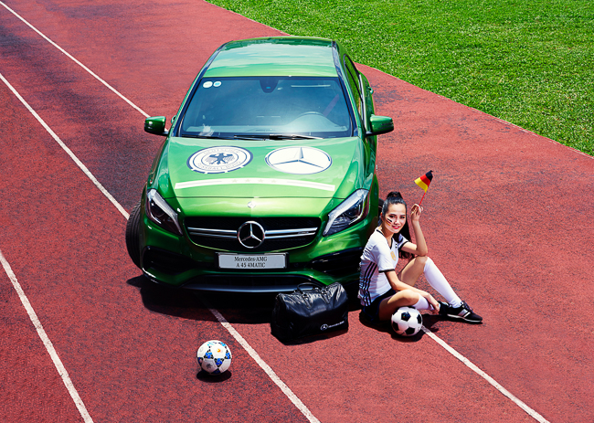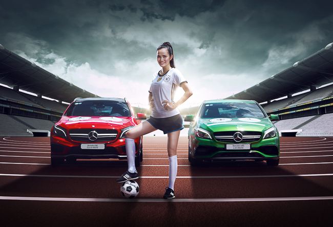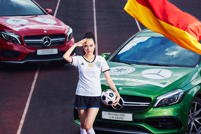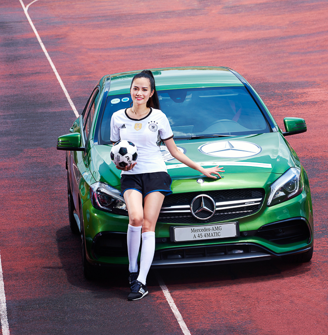 Tạm gác lại những bộ ảnh thời trang đầy gợi cảm, Diệu Linh đã khoác lên mình trang phục thi đấu năng động của tuyển Đức. Song hành cùng cô là hai mẫu xe hiệu năng cao đầy trẻ trung Mercedes-AMG A 45 4MATIC và Mercedes-AMG GLA 45 4MATIC. Đây là hai mẫu xe sở hữu động cơ 2.0 L mạnh nhất thế giới với công suất 381 mã lực và khả năng tăng tốc 0 - 100 km/h trong vòng 4,2 và 4,4 giây. Cả 3 “nhân vật” đặc biệt này đã cùng tạo nên một bộ ảnh đậm chất thể thao nhưng không kém phần duyên dáng.