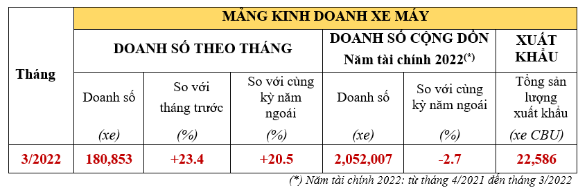 Dòng xe côn tay: Winner X, doanh số đạt 11.279 xe, chiếm 6.2% tổng doanh số bán xe máy của HVN trong tháng 3/2022.