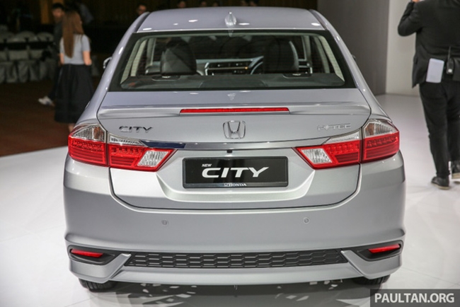 Đằng sau xuất hiện cản va thể thao hơn. Tương tự như trên, chỉ có bản 1.5 V cao cấp nhất được trang bị đèn hậu dạng LED tương tự trên Honda Grace Hybrid tại thị trường Nhật Bản. Chưa hết, Honda City 2017 tại Malaysia còn có cánh gió trên nắp cốp sau, tích hợp đèn phanh thứ ba dạng LED.