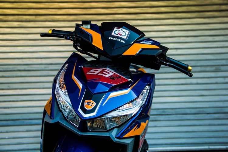 Thiết kế đầu xe được chủ nhân trang bị tem đấu số 93 (số áo của tay đua Marquez của đội Honda). Bên cạnh đó, trang bị cụm tay với tay thắng Brembo RCS cho phanh trước và tay thắng CRG Folding cho phanh sau.