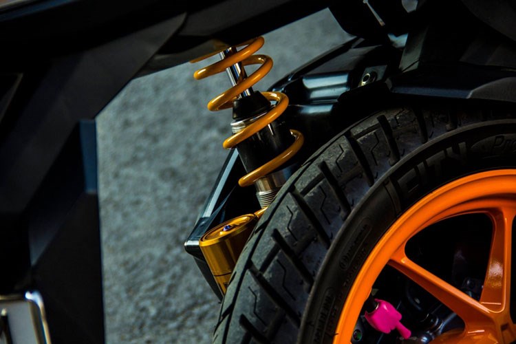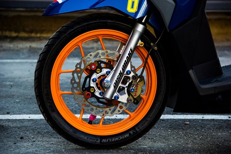 Dàn chân trước của xe đã được sơn phối màu cam cho tổng thể thêm nổi bật, đi cùng với đó là cặp vỏ Michelin City Pro, trang bị cụm phanh trước heo Brembo Billet và đĩa BrakeTech hàng hiệu thay thế cho hệ thống phanh nguyên bản của nhà sản xuất.