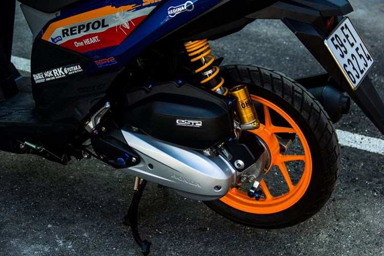Dàn áo Repsol nổi bật khiến nét đơn điệu của Honda Click 125i bản Thái Lan trở nên vô cùng cá tính. Ngoài ra, chủ nhân chiếc "xế độ" này còn nâng cấp xe với hàng loạt đồ chơi hàng hiệu.