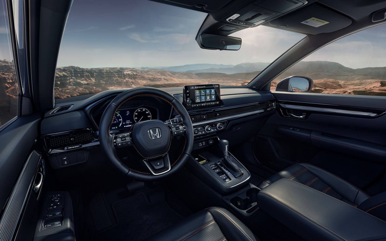 Bước vào bên trong, Honda CR-V 2023 chào đón người dùng với không gian nội thất có nhiều nét tương đồng Civic thế hệ thứ 11. Nội thất bản mới được thiết kế gọn hơn, hiện đại và thực dụng hơn, trang bị cụm đồng hồ đo kỹ thuật số 7 inch, trong khi các biến thể EX và Sport có màn hình thông tin giải trí 7 inch với các nút bấm vật lý để điều chỉnh âm lượng.