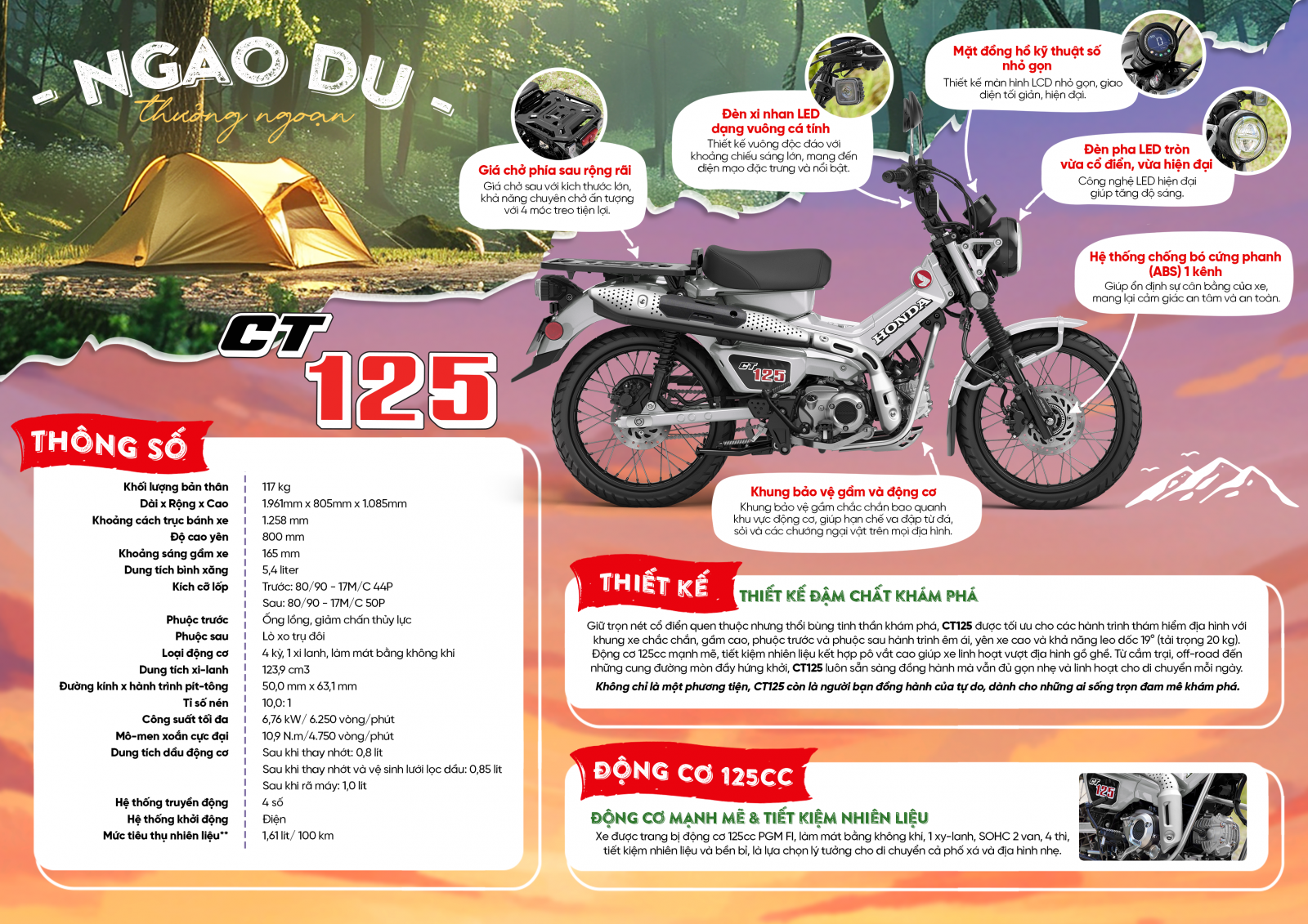Kế thừa DNA của dòng xe CUB Trail huyền thoại, CT125 là sự kết hợp giữa nét cổ điển và tinh thần khám phá hiện đại. Phong cách Trail đặc trưng với khung xe chắc chắn, gầm và yên xe cao, khả năng leo dốc 19° ấn tượng. Pô vắt cao cá tính, giúp vượt địa hình dễ dàng. Honda CT125 phân phối tại Việt Nam cũng sẽ sử dụng động cơ 125cc PGM-FI, làm mát bằng không khí. Chiếc xe có vài điểm thiết kế khá độc đáo như giá baga chở hàng lớn, xynhan hình vuông, pha tròn, lốp gai địa hình, hệ thống khung treo máy và bảo vệ động cơ chắc chắn…
