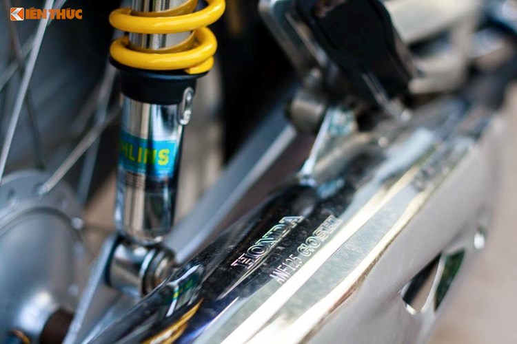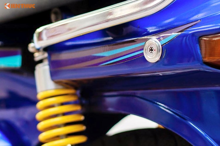 Phuộc sau của xe được thay mới dạng lò xo mới thay cho nguyên bản. Cặp phuộc độ màu vàng này khá nổi bật khi đối lập với màu xanh của thân xe.