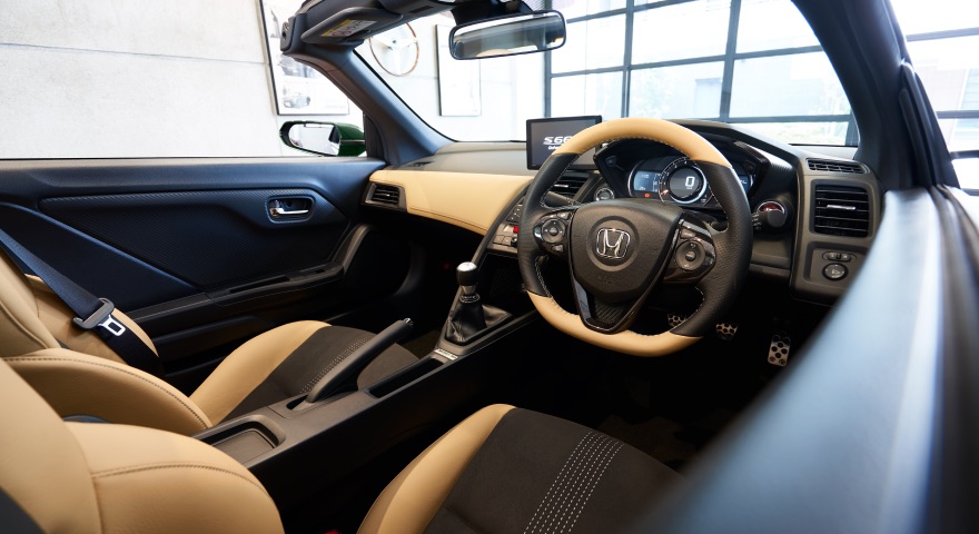 Ơ khoang nội thất, S660 Trad Leather Edition được bọc da phối 2 màu sáng màu và tối trên ghế thể thao, bảng điều khiển, vô lăng...Dòng chữ 'Trad Leather' đánh dấu phiên bản đặc biệt được in trên trên bảng bằng nhôm đặt bên cạnh cần số.