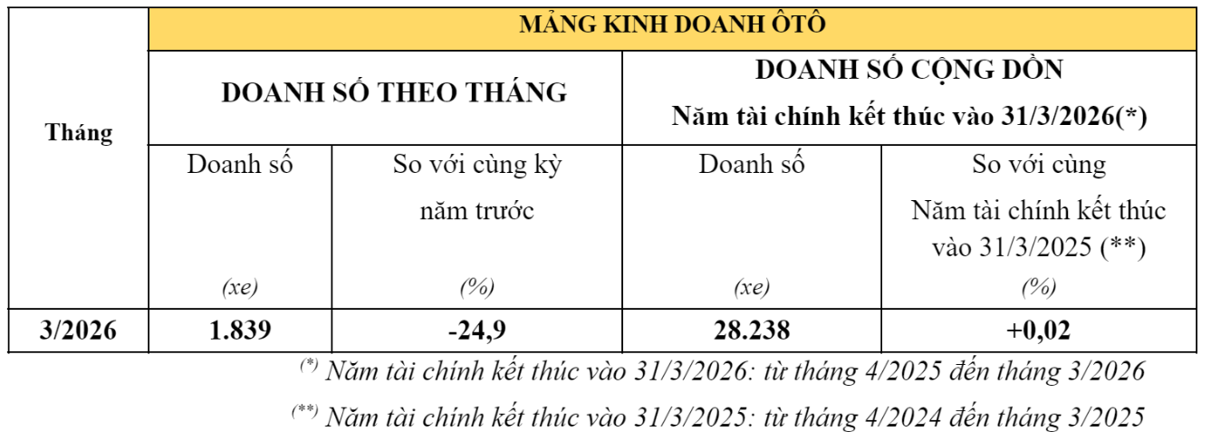 Ở mảng ô tô, HVN ghi nhận doanh số bán lẻ 1.839 xe trong tháng 3/2026, giảm 24,9% so với cùng kỳ năm 2025. Mức sụt giảm này cho thấy áp lực cạnh tranh ngày càng lớn trong thị trường ô tô, đặc biệt ở các phân khúc phổ thông.