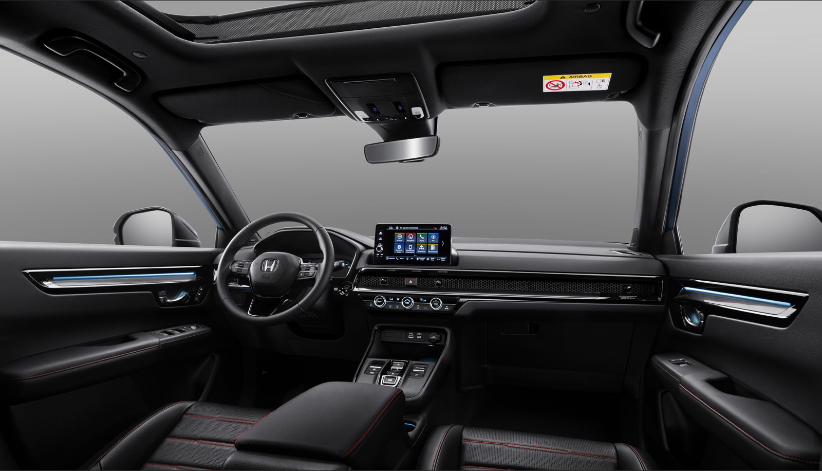 Không gian nội thất tiếp tục là điểm mạnh với khoang cabin 5 chỗ rộng rãi, bảng đồng hồ kỹ thuật số 10,2 inch, màn hình giải trí trung tâm 9 inch hỗ trợ kết nối điện thoại thông minh không dây. Bản e:HEV RS được trang bị thêm HUD hiển thị kính lái, cửa sổ trời toàn cảnh và hệ thống âm thanh BOSE 12 loa. Hệ thống kết nối viễn thông Honda CONNECT cho phép người dùng theo dõi, điều khiển xe từ xa, gia tăng tiện ích trong quá trình sử dụng.