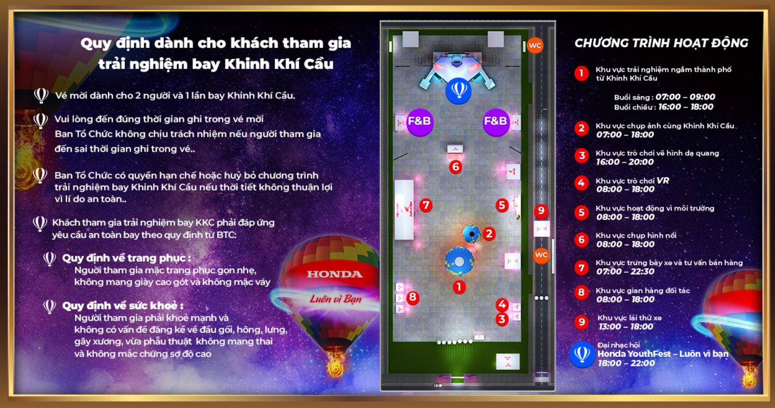 Đến tham dự sự kiện các khách hàng sẽ được hòa mình vào rất nhiều hoạt động hấp dẫn trải dài xuyên suốt từ 07:00 sáng tới 21:30 tối. Tại sự kiện ban ngày, các khách hàng sẽ được trải nghiệm các hoạt động gồm có: trải nghiệm khinh khí cầu bằng công nghệ VR thực tế ảo, chụp hình nổi “Tạo dáng sâu – hình cực ngầu”, tham qua khu trưng bày xe “Săn xe – khoe cá tính”, tham gia khu trò chơi hình vẽ dạ quang “Sáng tạo – bật phong cách”, tham gia khu vực hoạt động vì môi trường “Sức trẻ thay đổi tương lai”, tham quan khu vực các gian hàng đối tác “Đồng hành cùng phong cách trẻ”.
