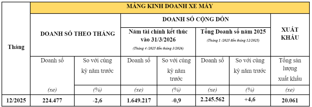 Doanh số xe máy trong tháng 12/2025 đạt 224.477 xe, giảm nhẹ 2,6% so với cùng kỳ năm trước. Tuy nhiên, tính theo chu kỳ cả năm 2025, tổng doanh số xe máy lại tăng trưởng ấn tượng 4,6%, đạt 2.245.562 xe.