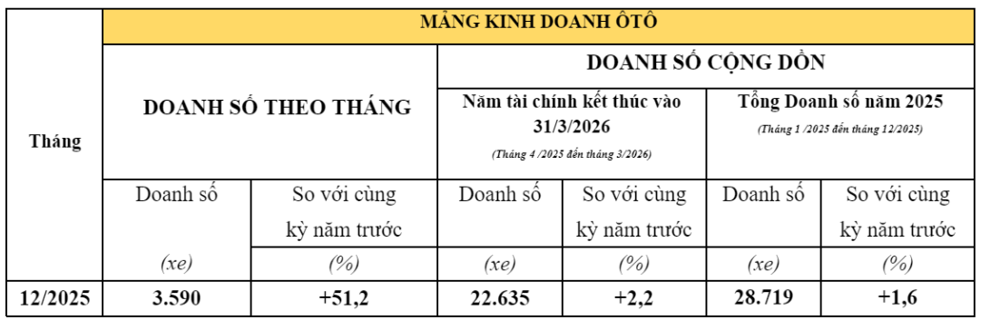 Doanh số tháng 12/2025 đạt 3.590 xe, tăng mạnh 51,2% so với cùng kỳ năm trước. Đây được xem là một trong những tháng bán hàng sôi động nhất của HVN trong năm, nhờ nhu cầu mua xe cuối năm tăng cao cùng chính sách ưu đãi tại đại lý.