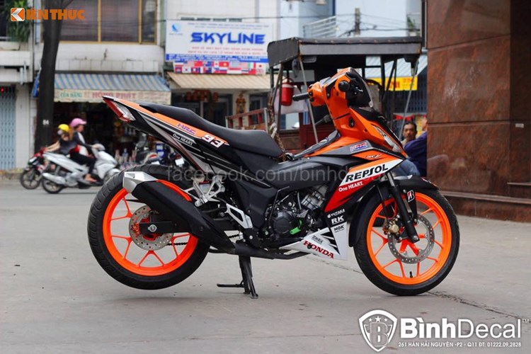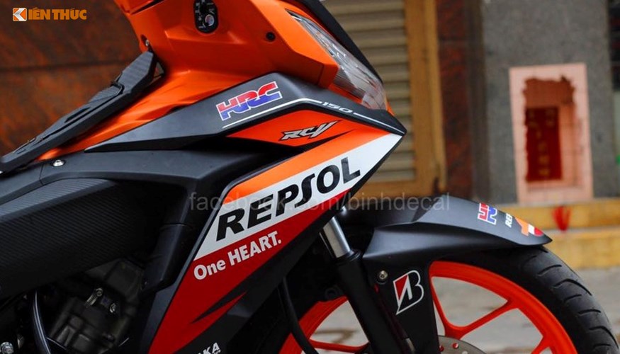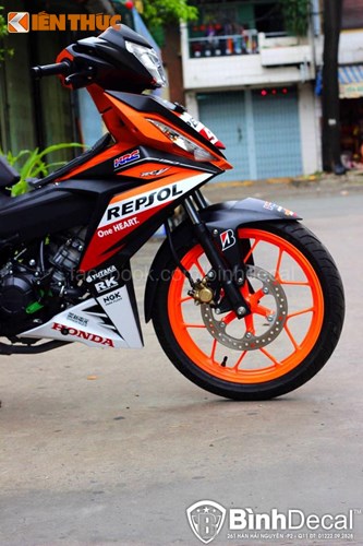 Ở bản độ này, chiếc xế nổ côn tay Winner 150 Repsol lấy màu chủ đạo Cam/ Đen với nhiều đường sọc màu trắng. rên cánh bửng ghi rõ chữ Repsol cùng nhiều logo khác như HRC, RCV,... đậm chất môtô đua GP.