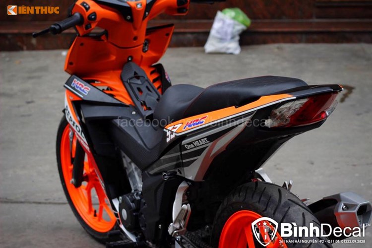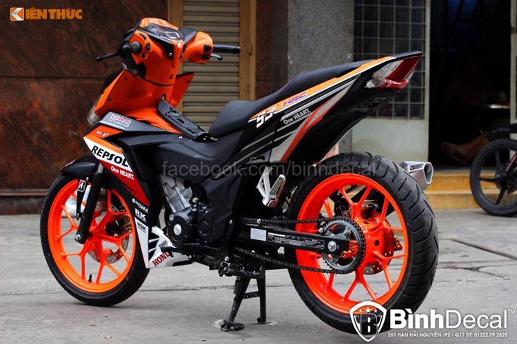 Trên bản độ Honda Winner 150 này, ngoài dàn áo dán tem Repsol cùng mâm và một số chi tiết màu cam nổi bật - chiếc xe này không có gì thay đổi so với những chiếc xe côn tay Winner mà Honda đang bán ra tại thị trường Việt Nam.