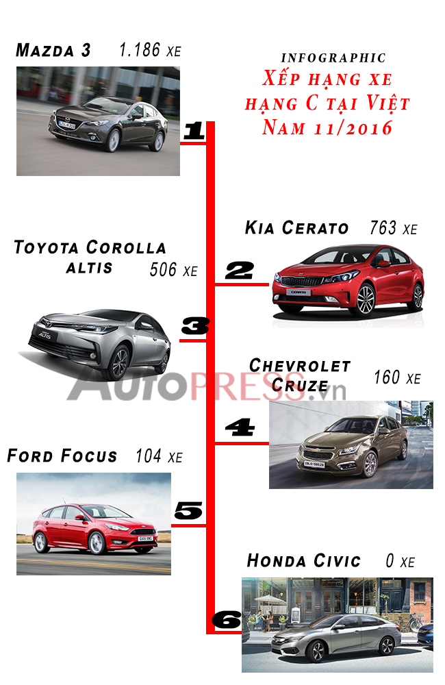 [Infographic] Bảng xếp hạng doanh số bán xe hạng C tại Việt Nam tháng 11 năm 2016