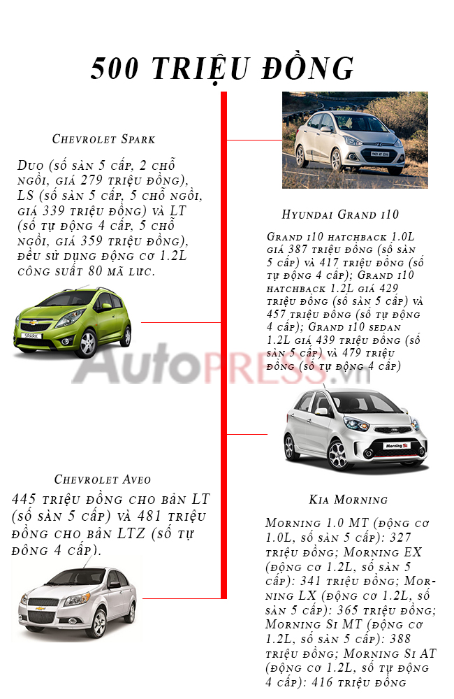 Thứ tư 07/12/2016 19:00 GMT+7Autopress.vn - Autopress - Chỉ với chi phí hạn hẹp tầm 500 triệu đồng cho một chiếc xe hơi mới, các bạn sẽ có những sự lựa chọn nào? Xin mời các bạn cùng tham khảo.