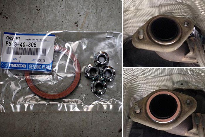 Các vật liệu thay thế liên quan gồm 2 gioăng ống xả cùng bốn ốc thay thế. Vị trí của gioăng thay thế ở cổ xả (ảnh phải); khi tháo ra phía trên, và khi lắp gioăng mới ở phía dưới. Bốn ốc được thay mới để tránh trường hợp đã bị già vật liệu ra nhiệt tỏa ra từ ống xả.