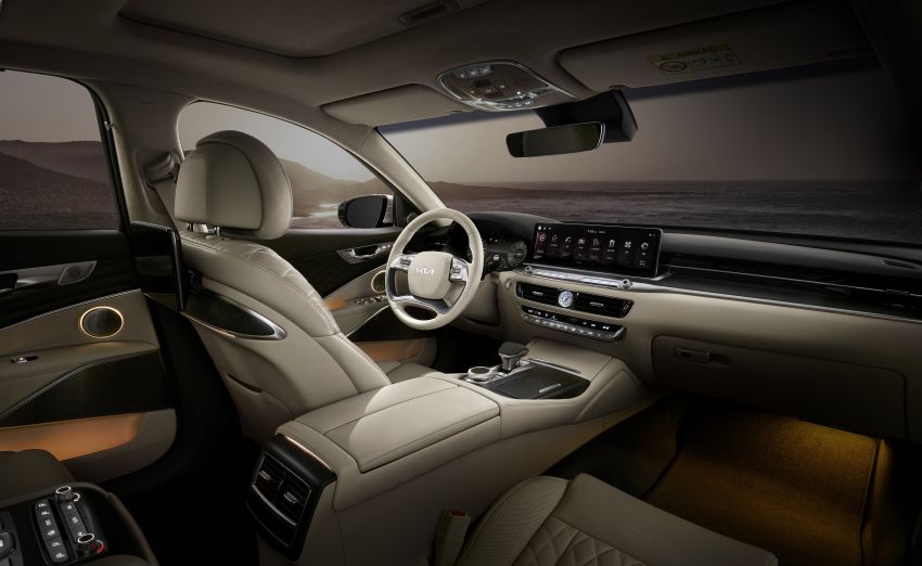 Theo đó, khoang nội thất của K9 2021 gần như tương đồng với thế hệ cũ với bố cục bảng điều khiển nằm ngang, màn hình cảm ứng cho hệ thống thông tin giải trí, vô lăng 4 chấu. Một số điểm mới nằm ở màn hình trung tâm kích thước lớn 14.5 inch thay thế cho loại 12.3 inch.