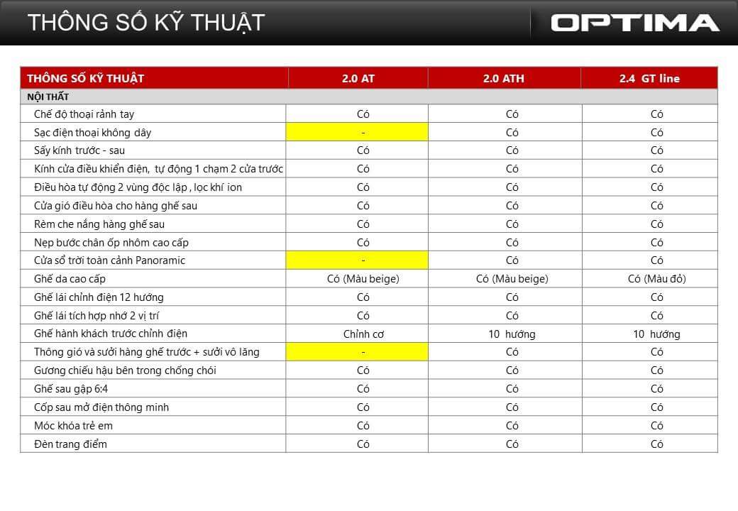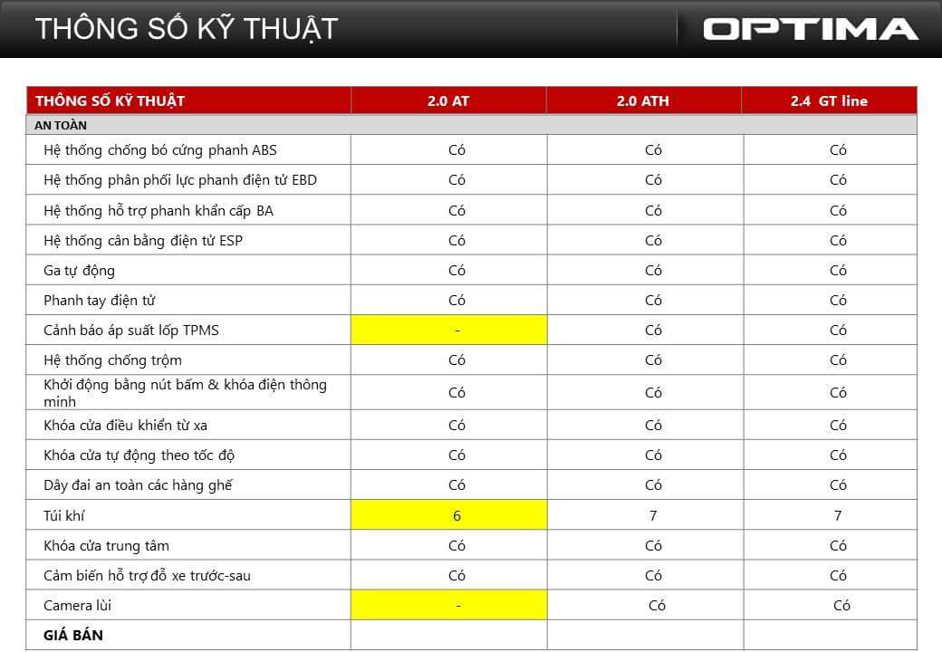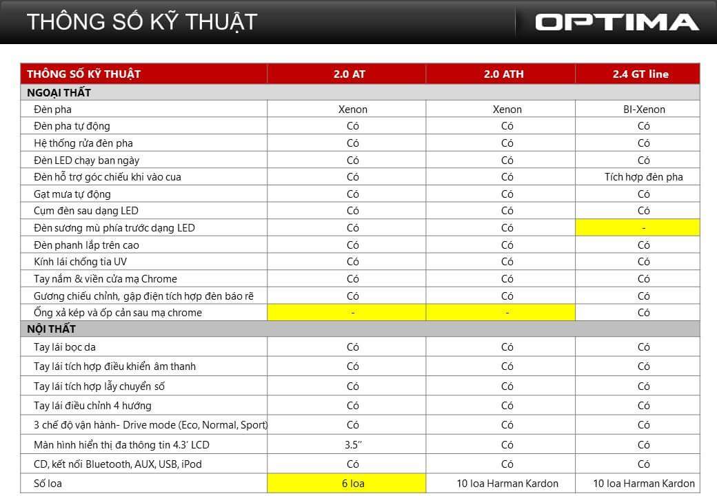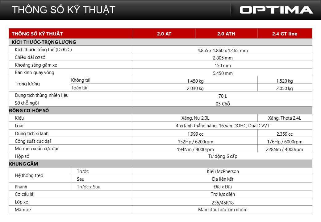 Theo như những hình ảnh bị rò rỉ, Optima 2016 sẽ có kích thước dài x rộng x cao lần lượt là 4.855 x 1.860 x 1.465 mm, chiều dài cơ sở 2.805 mm. Dự kiến sẽ có 3 phiên bản của xe này được phân phối tại Việt Nam gồm 2.0 AT, 2.0 ATH và 2.4 GT Line.