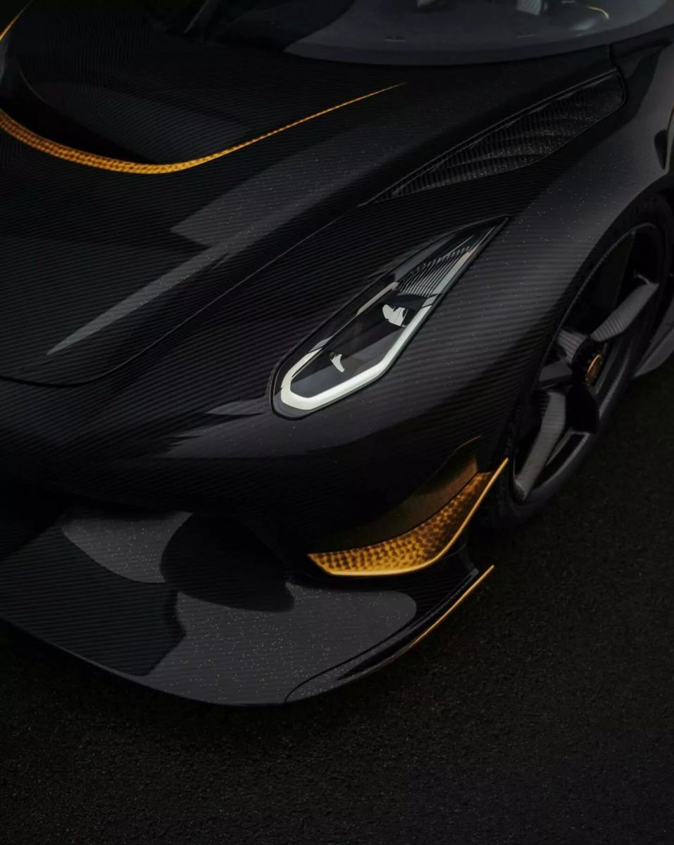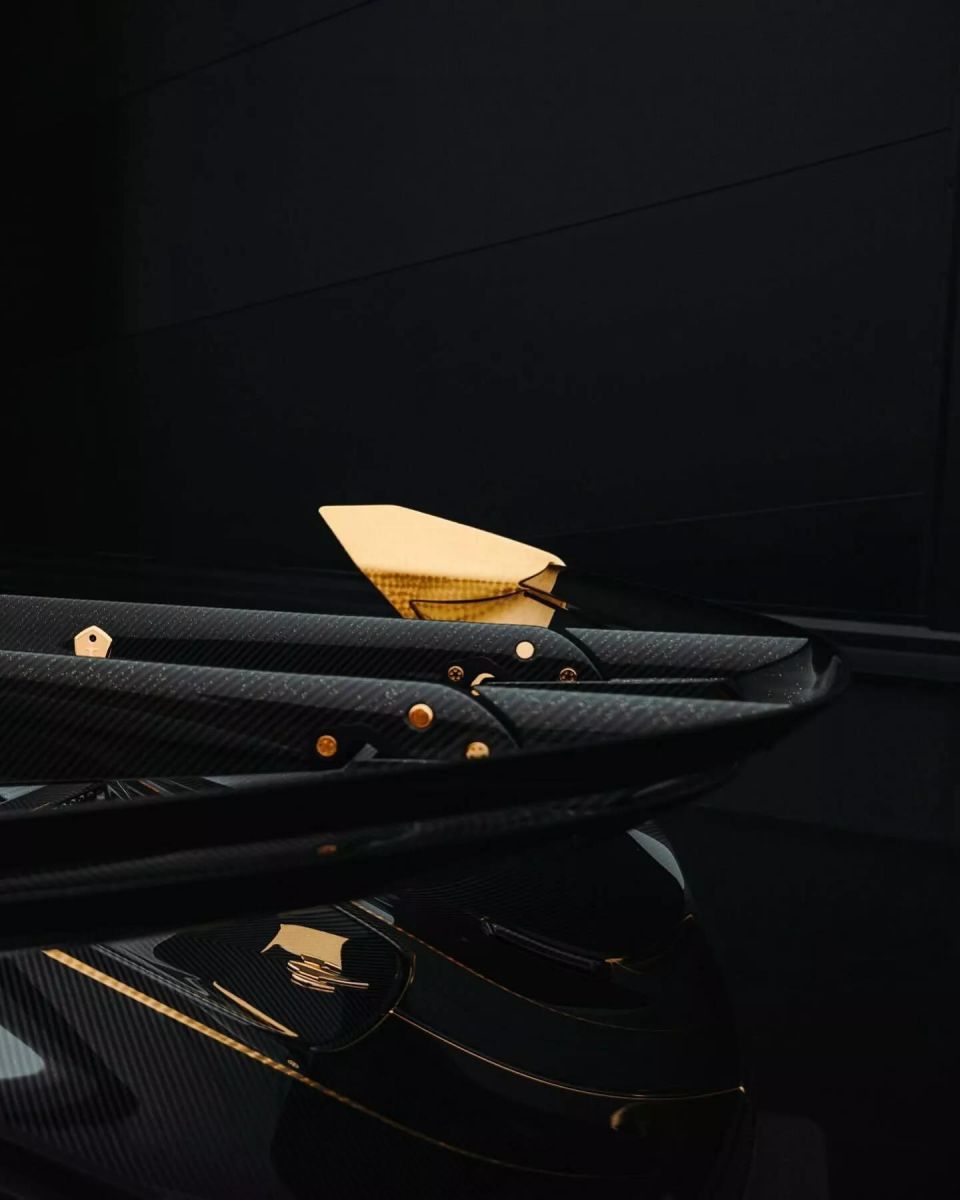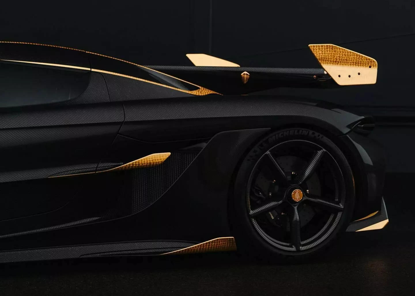 Một số thành phần được phủ vàng bao gồm các cánh gió cản trước, giá đỡ gương, chi tiết trang trí ở giữa cản trước, khí động học bên hông, tấm ốp cánh gió sau, logo Koenigsegg và đường chạy dọc mui xe.