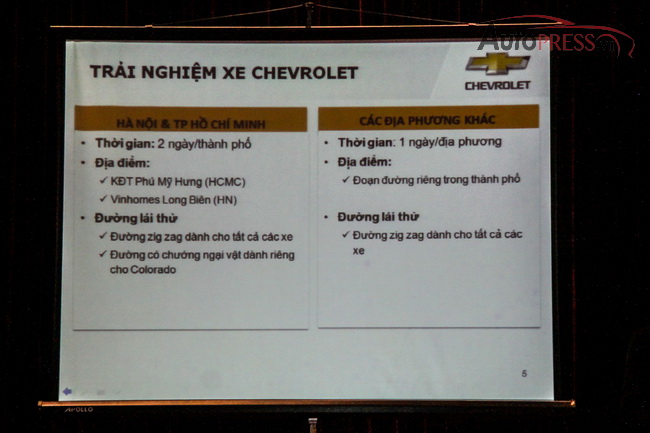 Khách hàng tham gia có thể lái thử cùng lúc 5 dòng xe được ưa chuộng nhất của Chevrolet bao gồm: Aveo(số tự động), Cruze, Orlando, Captiva, Colorado (cả số sàn và tự động). Khách hàng yêu thích dòng xe bán tải Colorado tại Tp Hồ Chí Minh và Hà Nội sẽ có những trải nghiệm khó quên với các bài thử chướng ngại vật đặc biệt là cầu nghiêng 20 độ. Đồng thời , khách hàng tham gia còn có cơ hội bốc thăm trúng thưởng nhiều giải thưởng có giá trị, bao gồm: