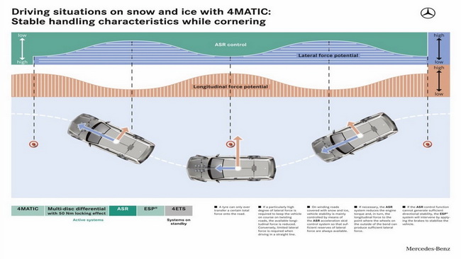 Hãng xe Mercedes-Benz cung cấp các thiết lập khác nhau tùy thuộc vào mục đích sử dụng của chiếc xe. Các mẫu C, E, S, CL, và CLS-Class được trang bị hệ thống dẫn động hiệu suất cao. Nhằm tăng lực kéo cho các bánh sau, nếu cần thiết hệ thống sẽ tự động tăng mô-men-xoắn cho bánh trước.