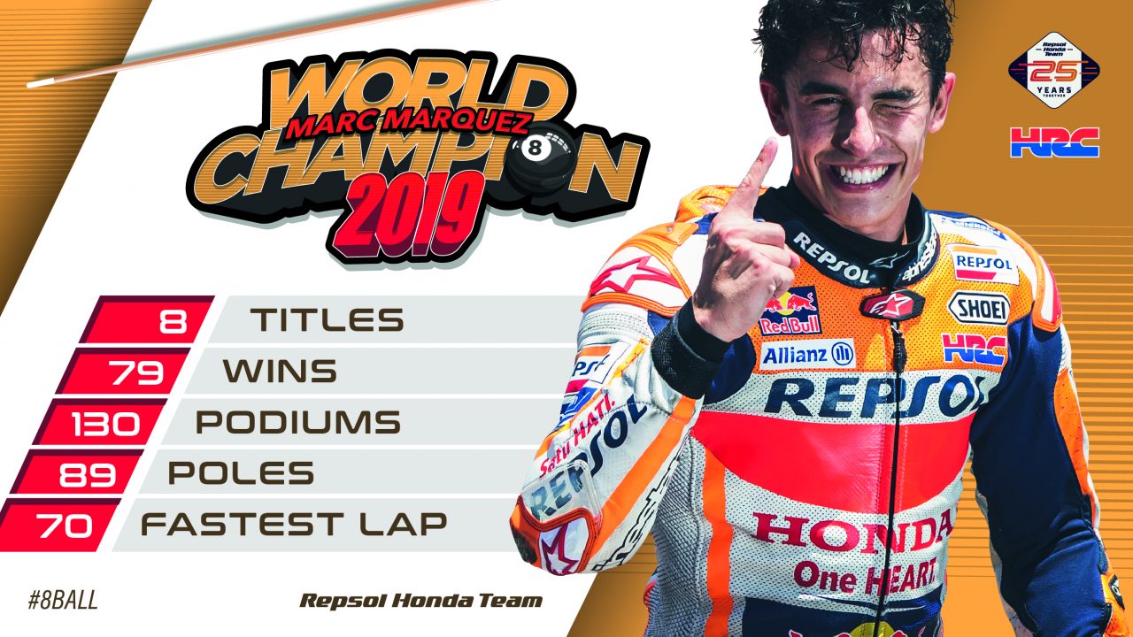 Tay đua Marc Marquez cho biết: “Tôi cảm thấy vô cùng hạnh phúc khi một lần nữa trở thành nhà vô địch thế giới khi khoác áo đội Honda. Mùa giải 2019 là một trong những mùa giải tôi có phong độ thi đấu ổn định nhất. Chúng tôi đã chiến đấu hết mình, cả đội nói riêng và Honda nói chung đã làm được những điều phi thường, để ngày hôm nay chúng tôi đứng ở vị trí này. Kỉ niệm 60 năm hoạt động đua xe thể thao của Honda bằng một chức vô địch MotoGP thực sự là một điều vinh dự, và tôi tự hào vì đã làm được điều đó cho Honda. Tôi muốn gửi lời cảm ơn đến tất cả mọi người đã góp sức trong mùa giải này, những người hâm mộ đã luôn bên cạnh ủng hộ chúng tôi!”
