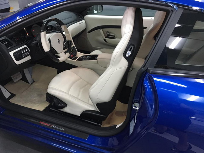 Nội thất xe sang trọng và thể thao với tông màu đối lập là đen và trắng. Chất liệu chính được sử dụng là carbon và da cao cấp, ghê ngồi, vô lăng 3 chấu thế thao đều bọc da và các chi tiết còn lại thì được phủ carbon. Ở ngay phía dưới cửa còn có dòng chữ Maserati GranTurismo MC Stradale xuất hiện.
